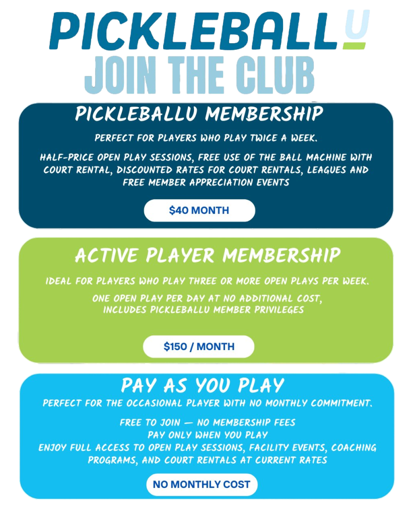 PickleballU offers flexible membership options for individuals, couples, and families looking to save on court time and gain access to exclusive perks. With discounted rental rates, half-off open play, and early booking privileges, members enjoy both savings and convenience. Memberships also include deals on lessons, clinics, and leagues, along with access to special appreciation events. Whether you play weekly or daily, PickleballU membership is a cost-effective way to stay active and involved — while walk-ins and visitors are still always welcome.